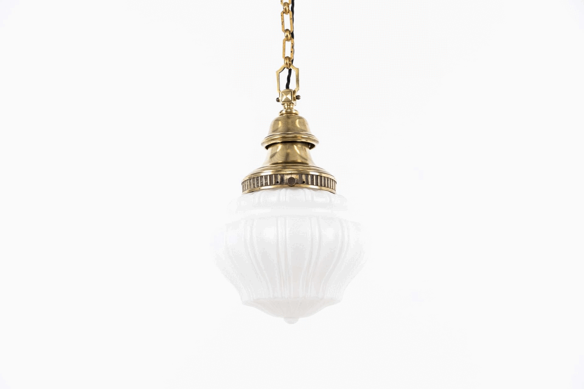 Opaline glass shade of pressed form, with its original cast brass gallery, as shown in an original catalogue from 1935. An all round superb lamp of very high quality.