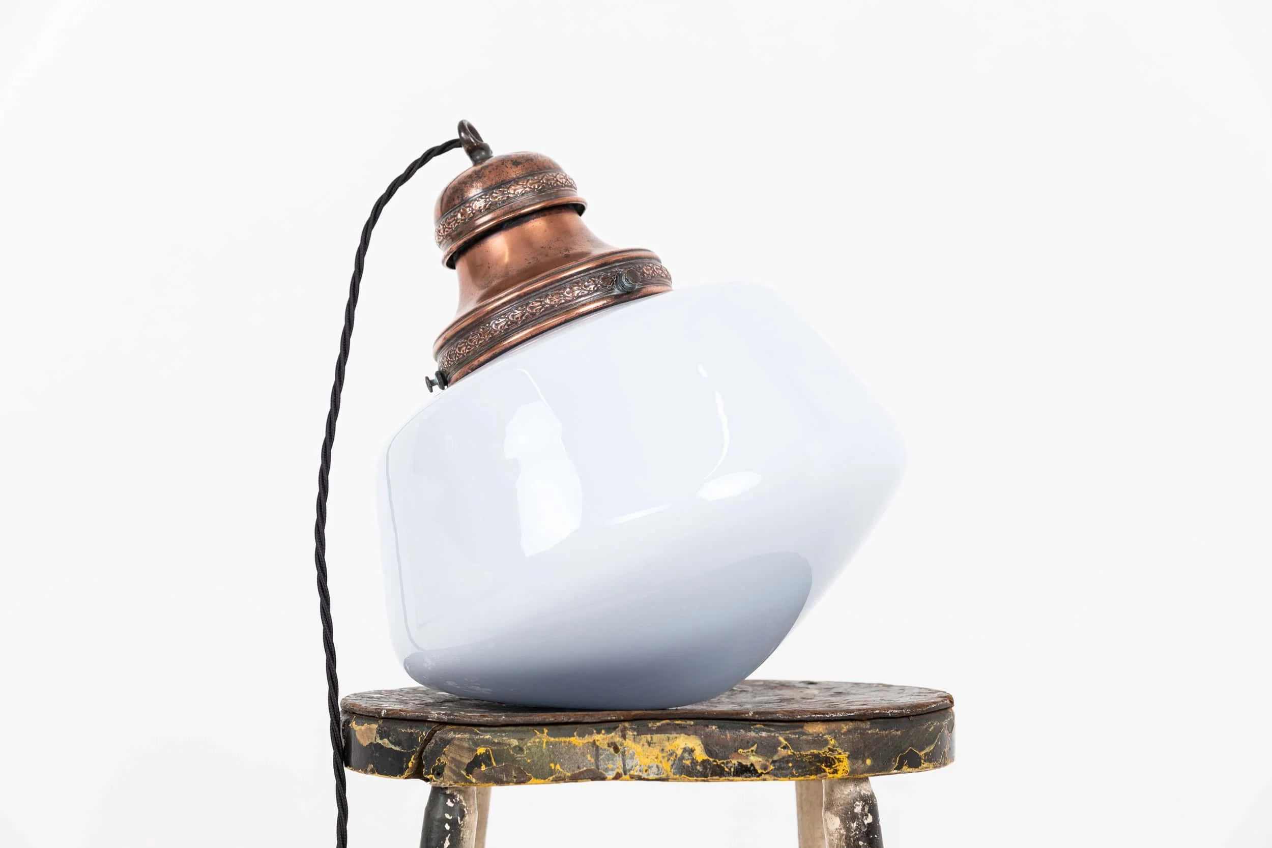 A beautiful church opaline glass pendant lamp with copper gallery. c.1930