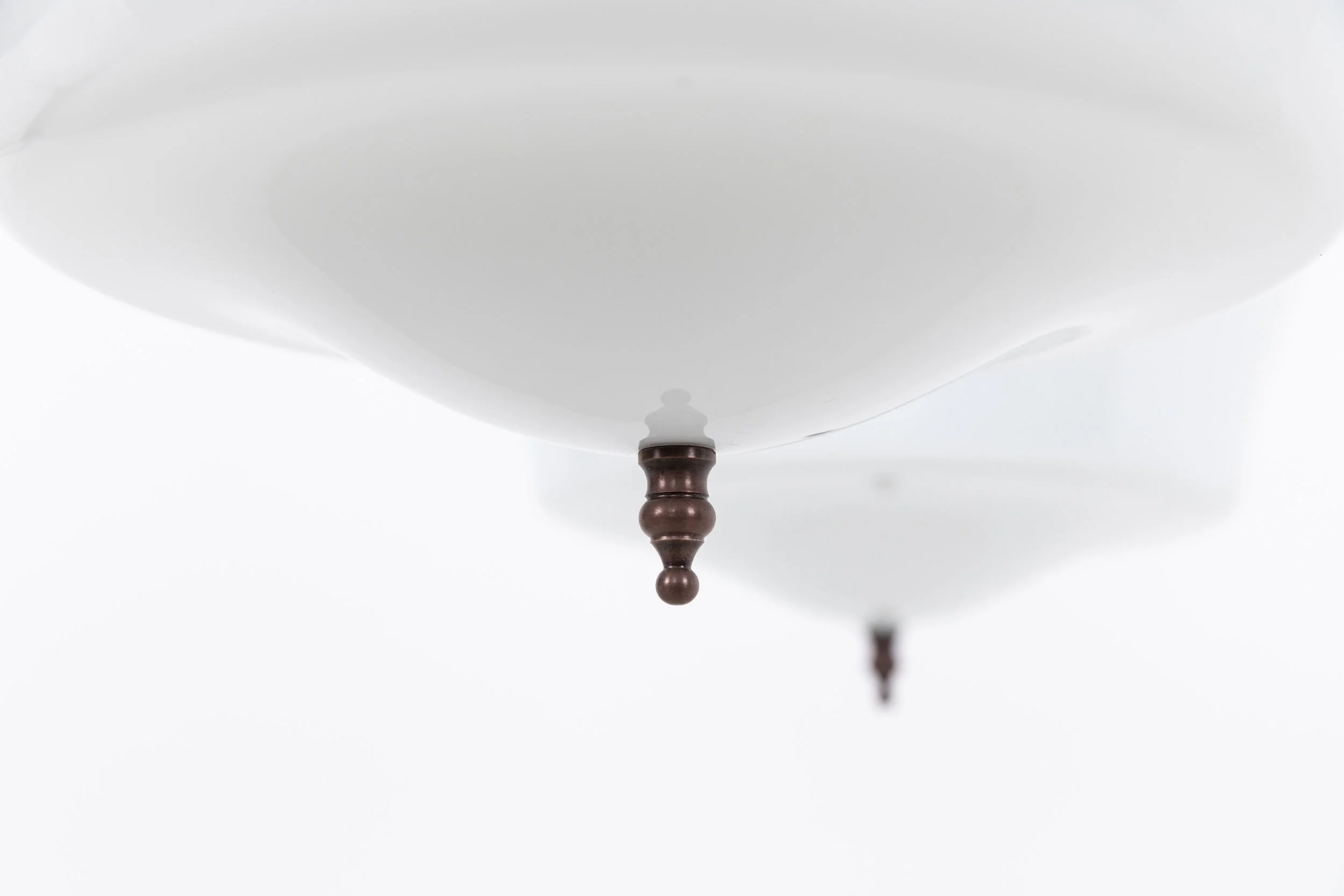 Moulded opaline glass shade, this shape of lamp were often found in churches and chapels up and down the country. Complete with its patinated copper GEC gallery and finial. Price is per light.