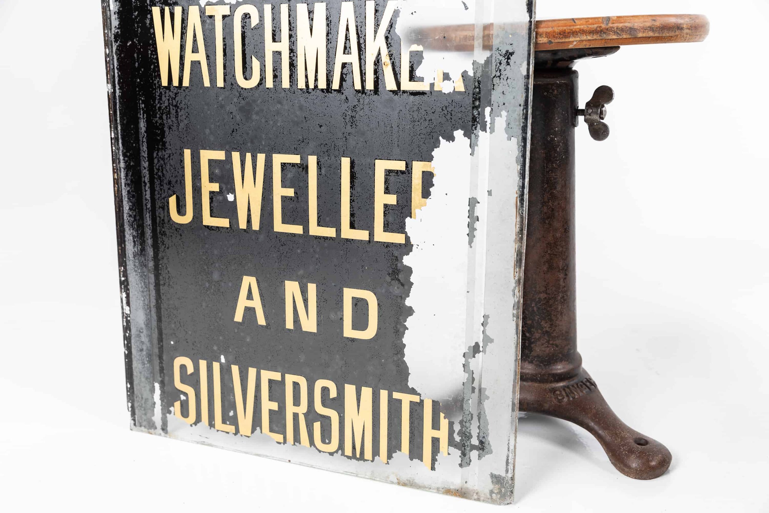 Heavily distressed reverse painted plate glass in black and gold leaf for a jewelers shop.