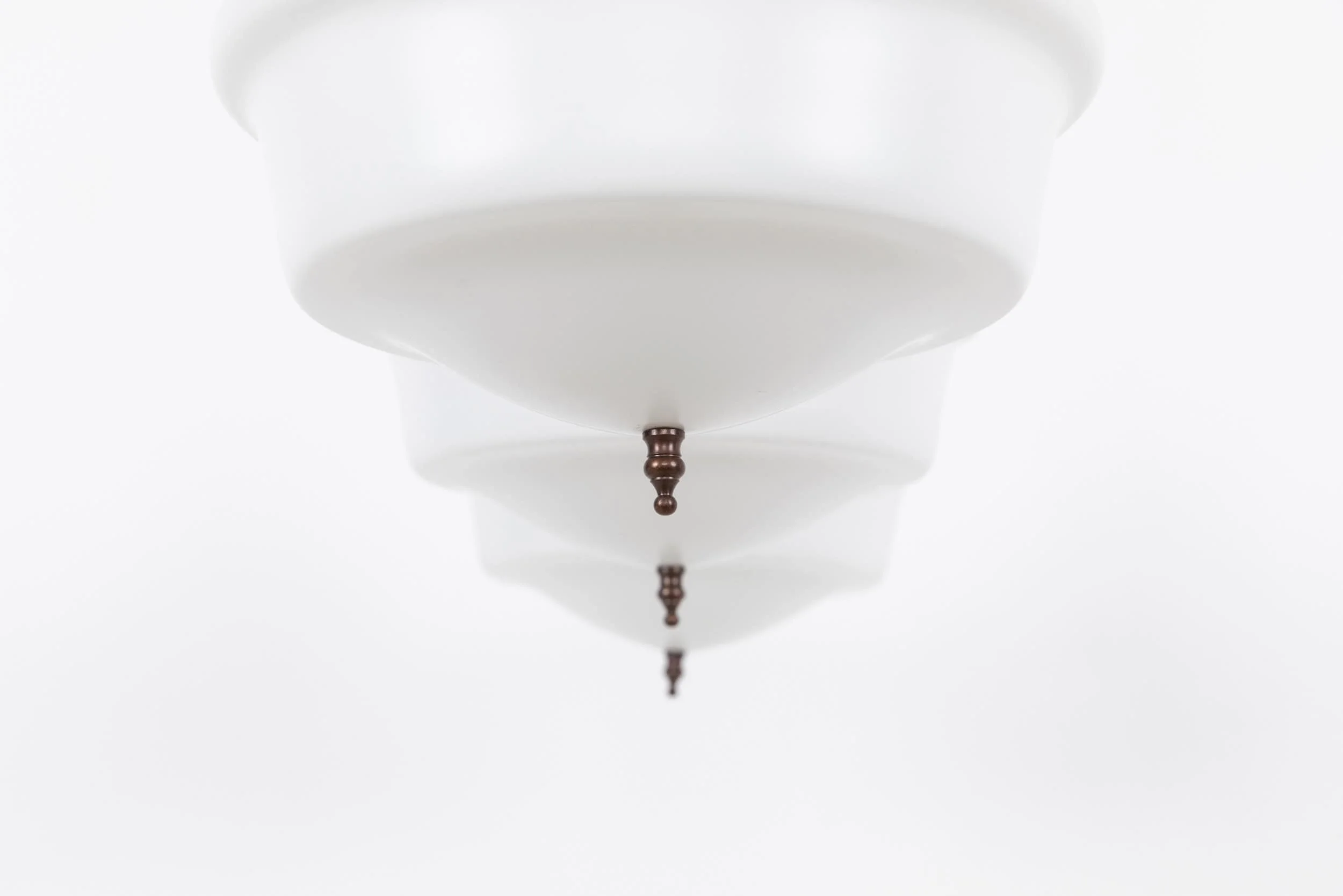 Moulded opaline glass shade with a satin finish, this shape of lamp were often found in churches and chapels up and down the country. Complete with its patinated copper plated brass GEC gallery and finial. Price is per light.