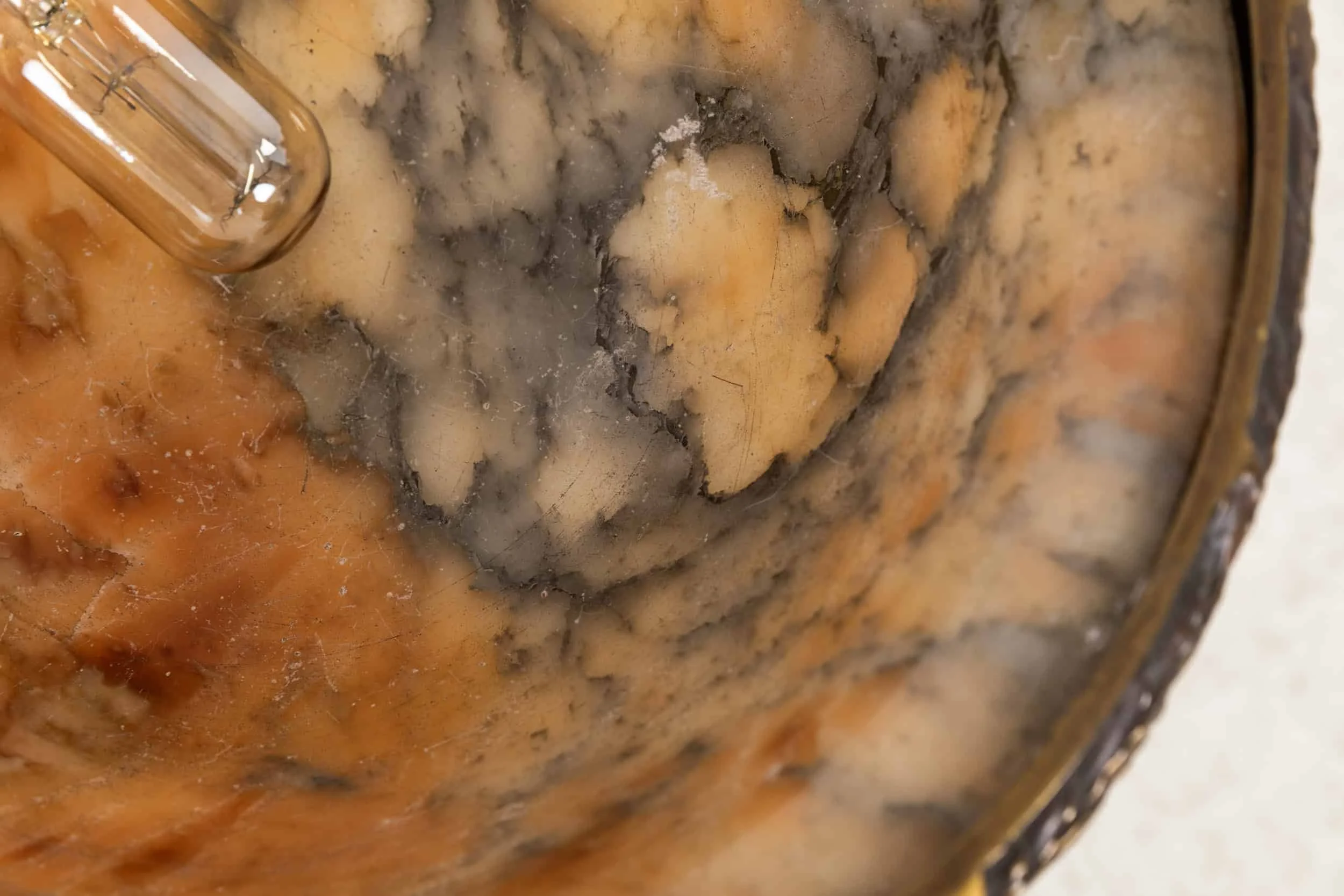 Vibrantly coloured alabaster with an incredible array of marbled figuring. The hand-carved bowl set in a high quality brass ring, cast with some beautiful details including cherub faces. Mounted directly to the ceiling via its original and decorative ceiling rose.