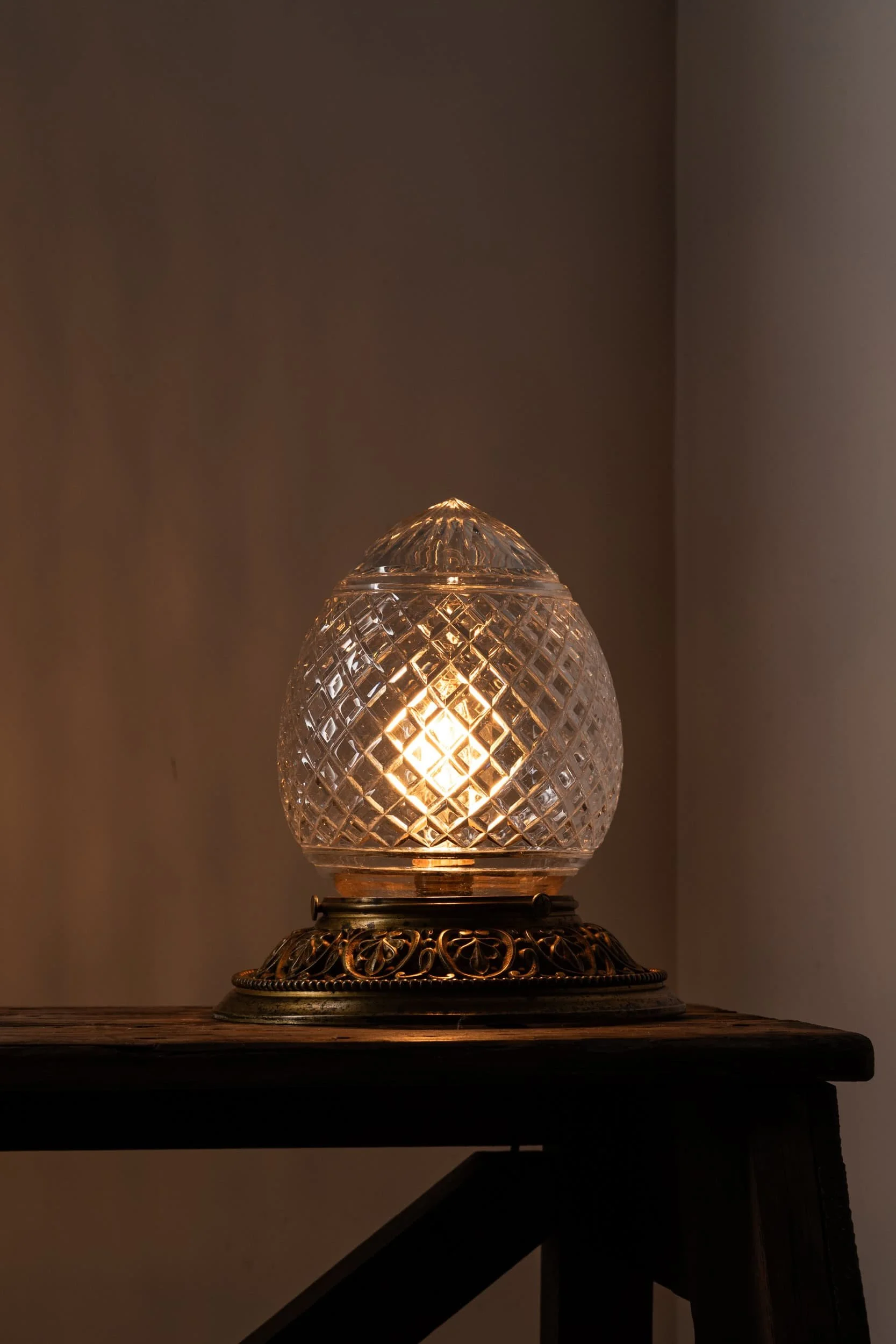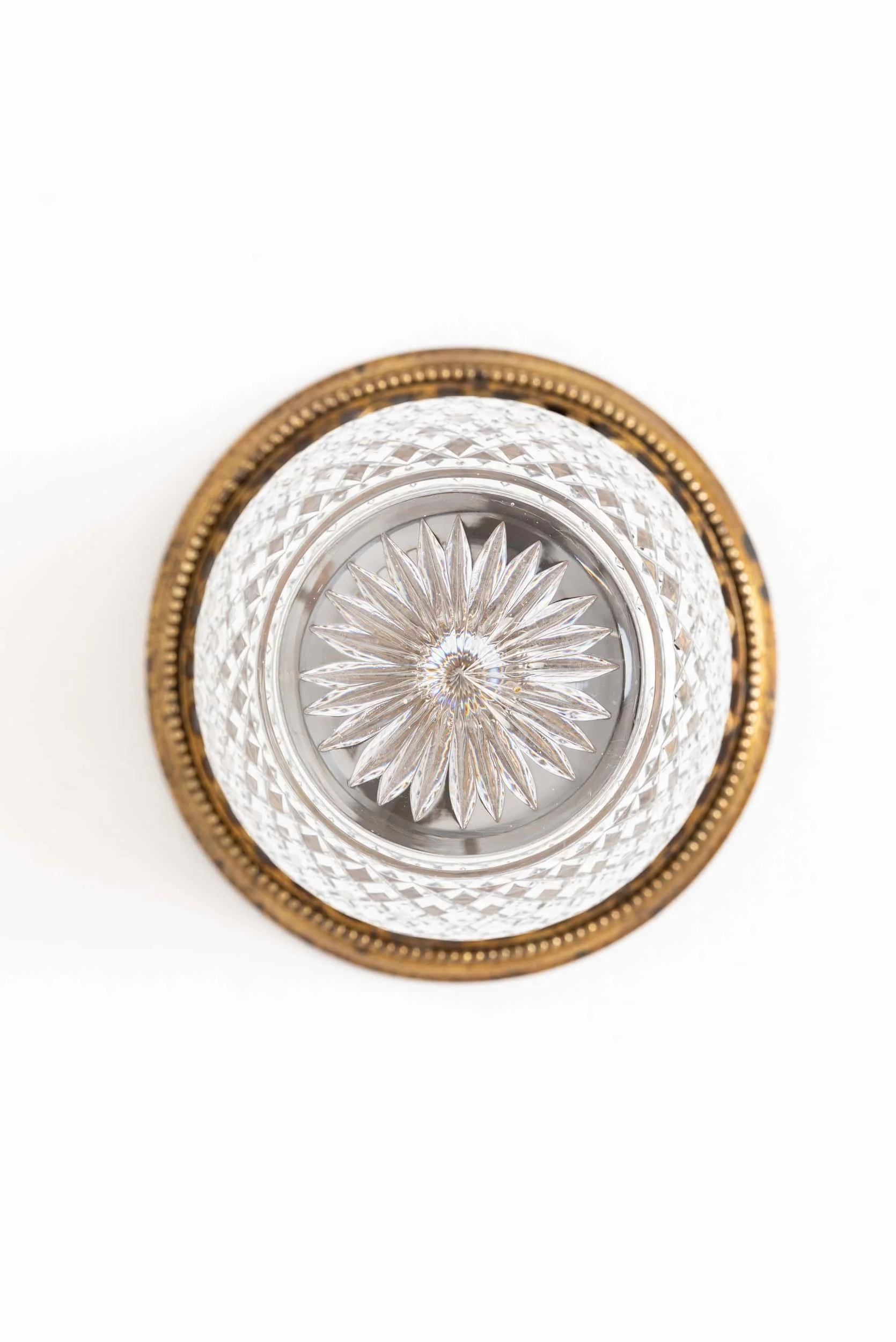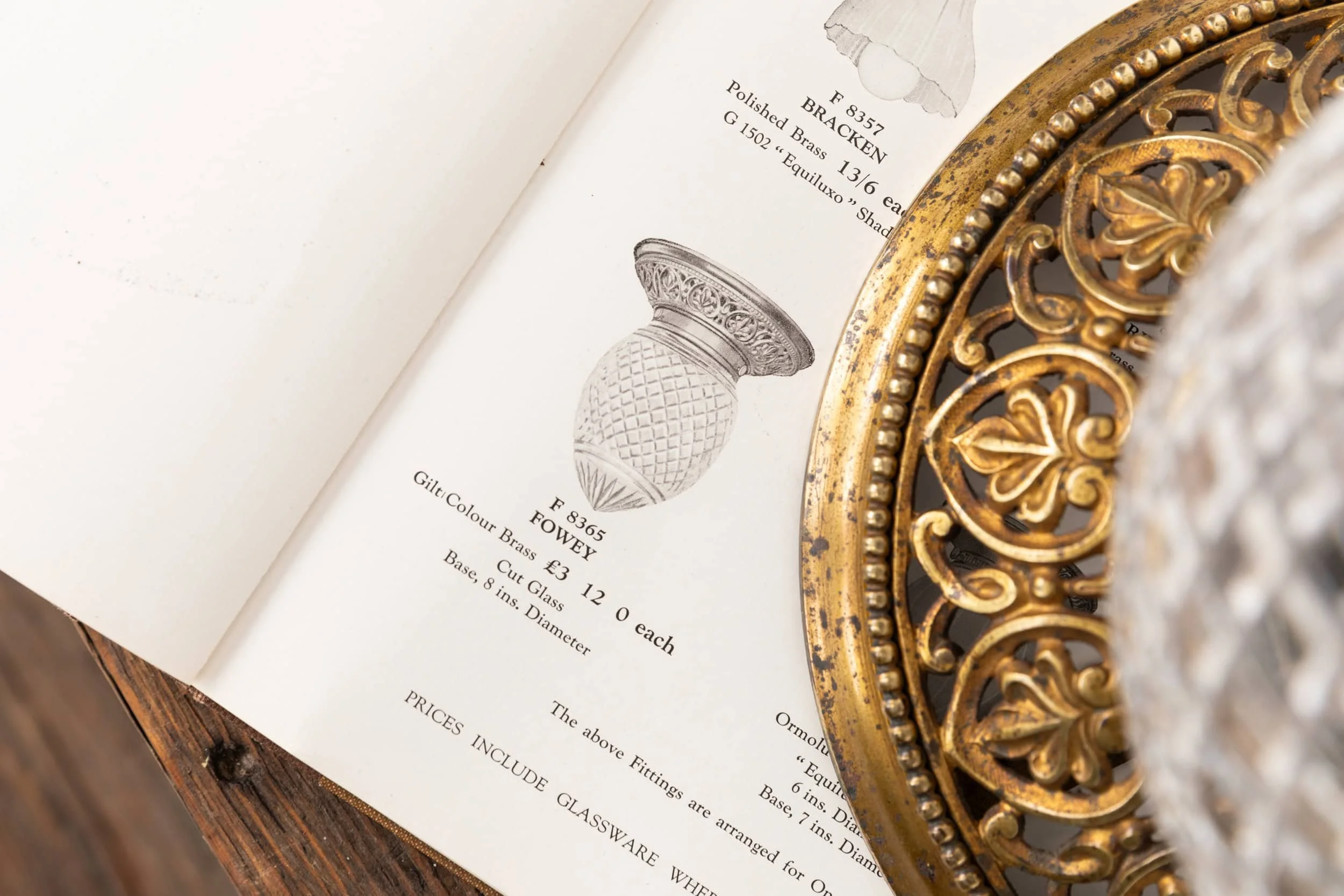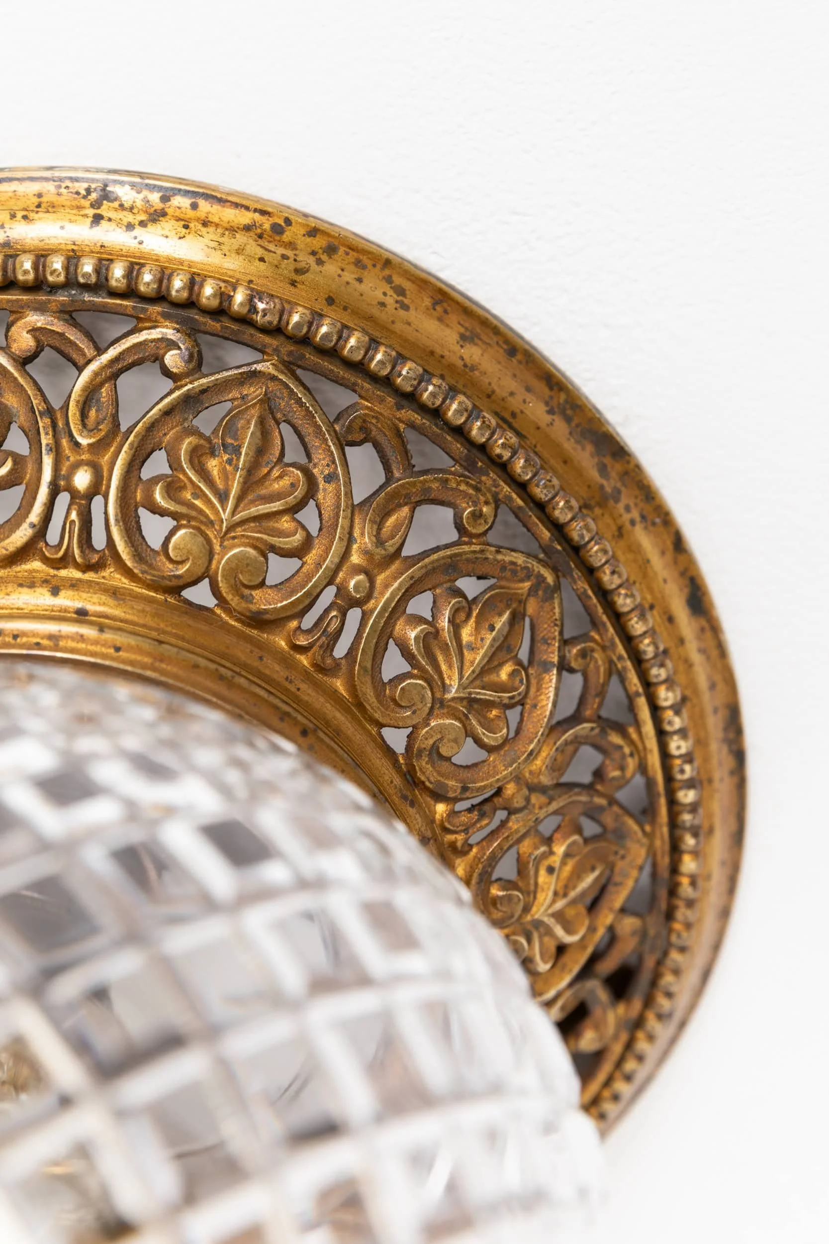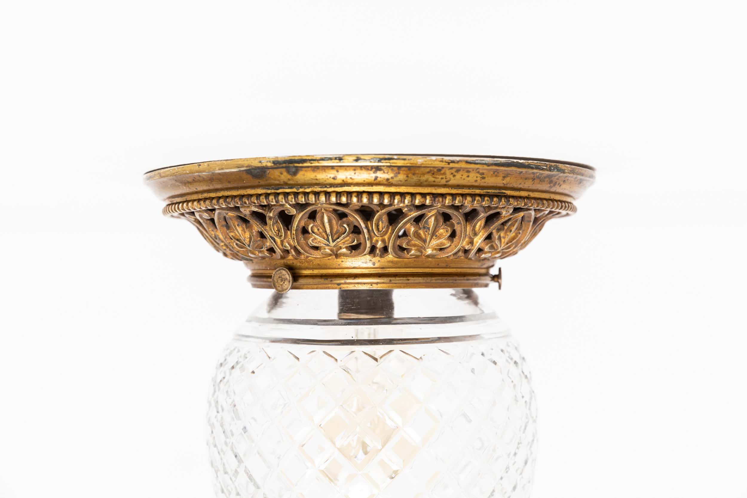 The hand‑cut glass shade follows a classic, elegant form. It’s paired with a beautifully aged original gilt brass flush mounted gallery which has aged to perfection. As shown from an original GEC catalogue.