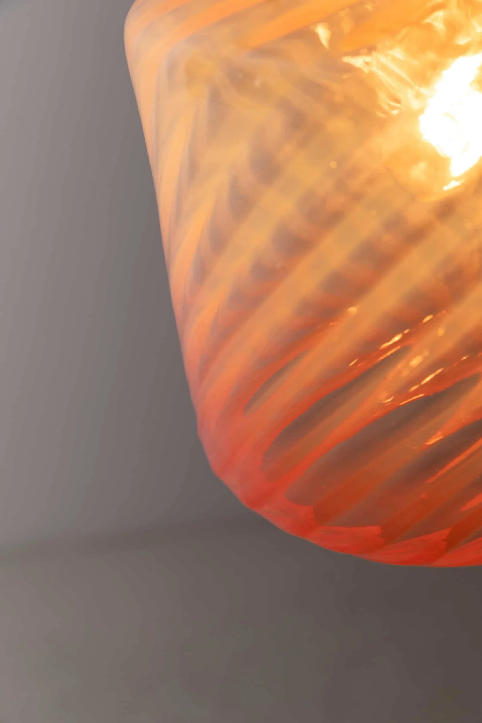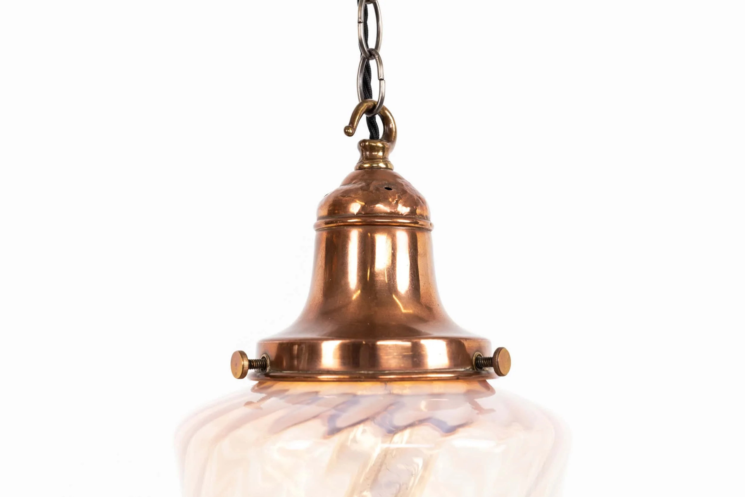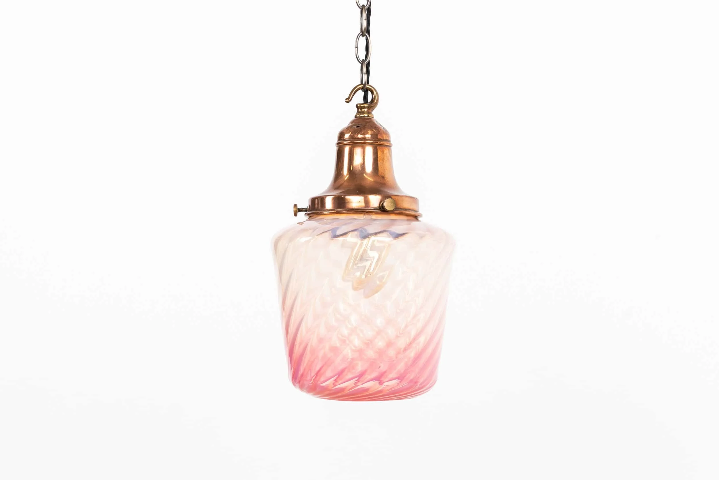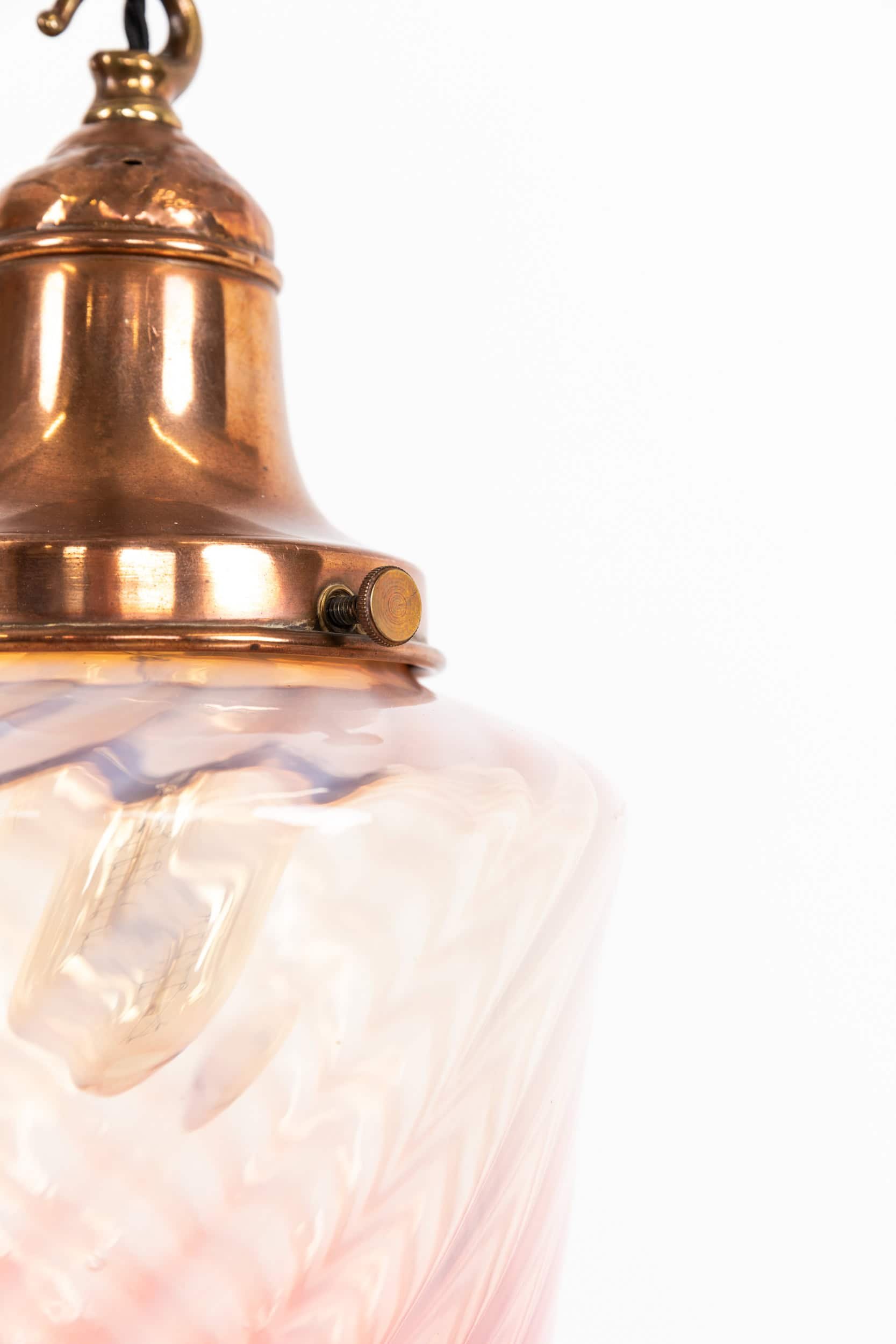 Hand‑worked swirled glass with a striking pink gradient, the colour shifting beautifully when lit. Finished with a period copper gallery that complements the warmth of the glass without competing with it. A lively, sculptural example of 1920s decorative glasswork.