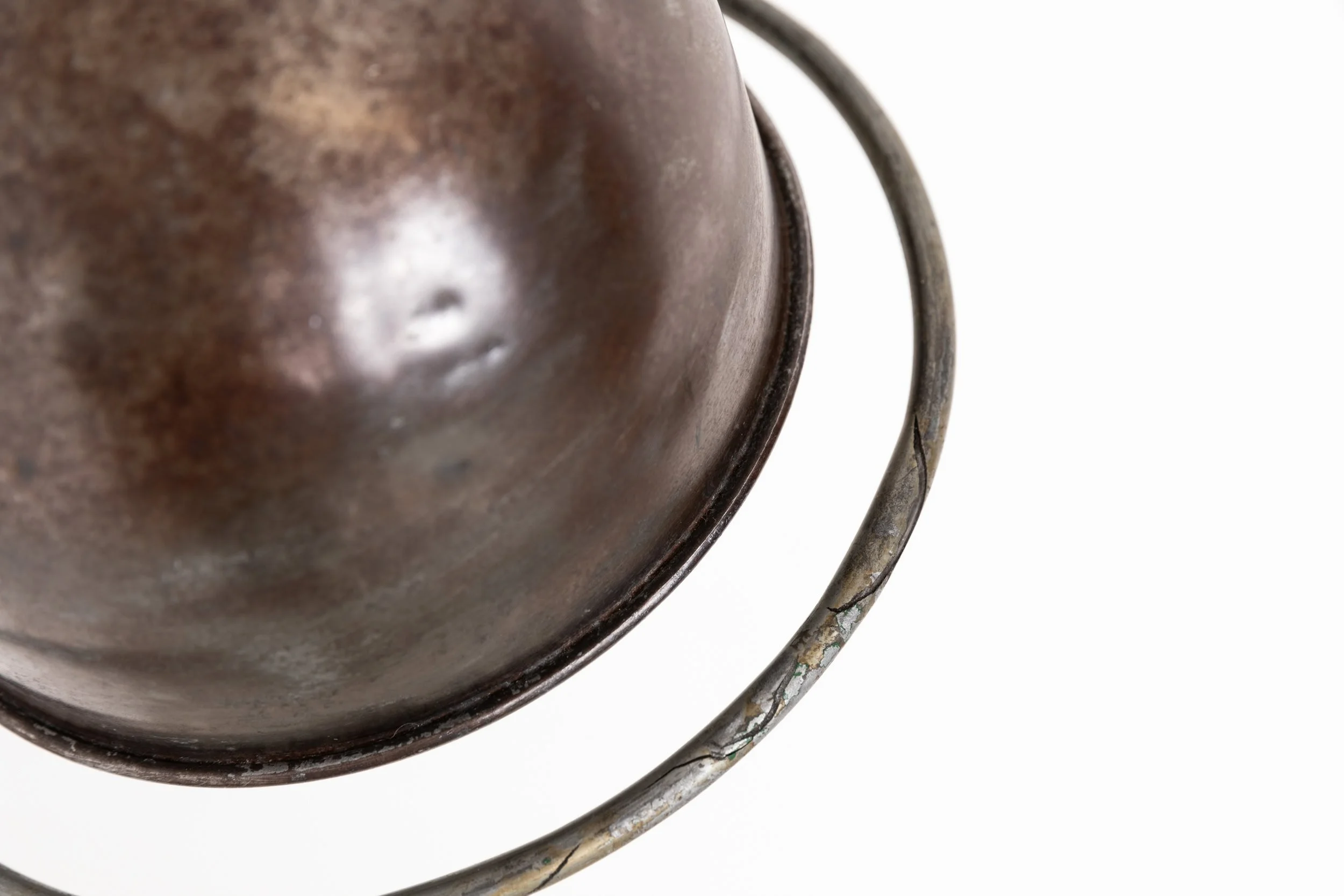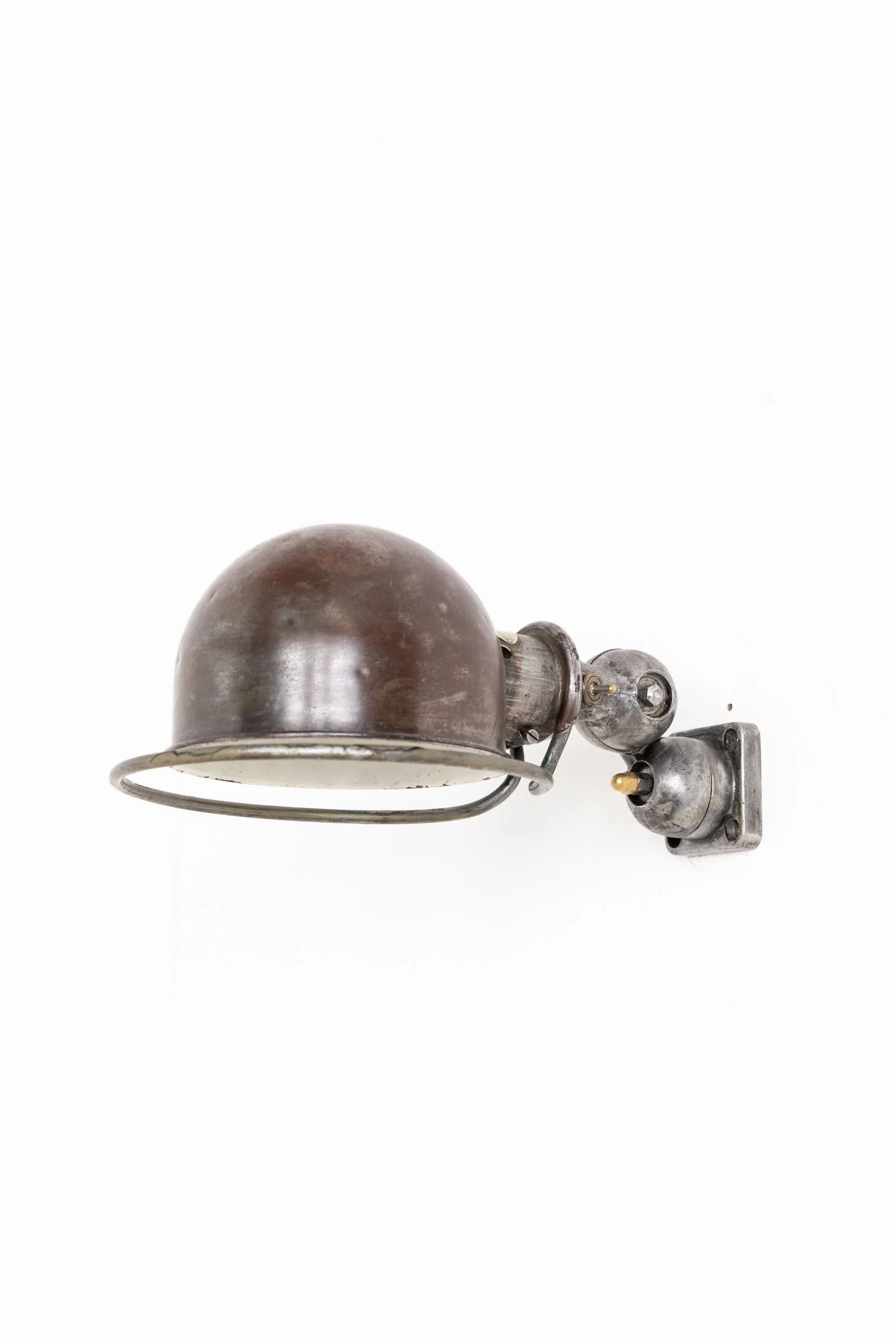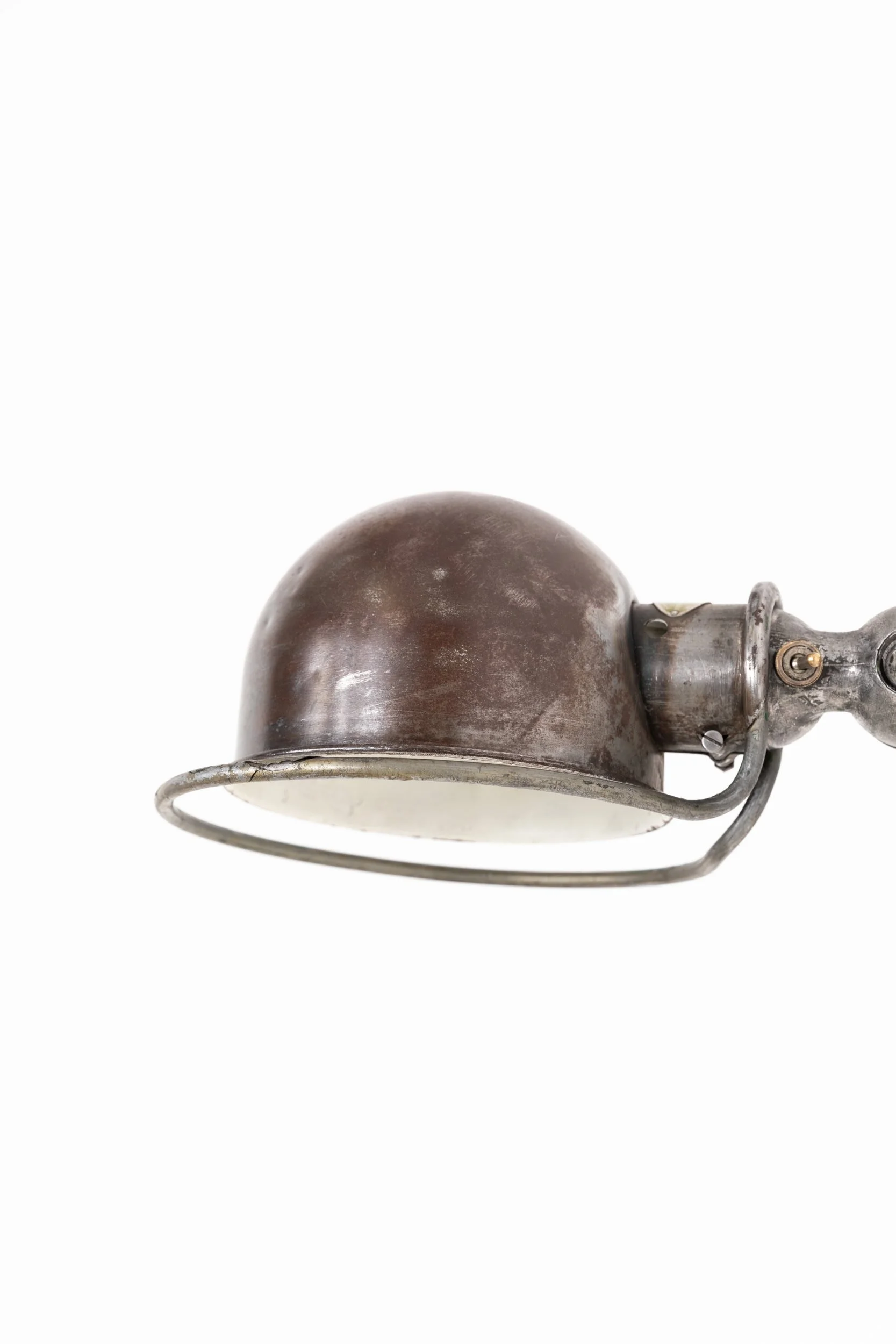 Designed for use on workshop machinery in demanding industrial environments, the Jieldé lamp was engineered for absolute simplicity, reliability and ease of repair. This example retains its original printed maker’s plate and the characteristic heavy‑duty toggle switch. The paint has been stripped back, leaving factory marks and natural tarnish visible across the metal, details that underline its authentic industrial character.